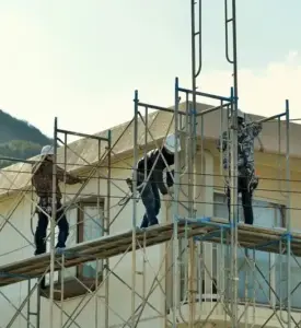 足場工事の金額にもっとも影響しやすいのが、建物の大きさと高さです。足場は外周の長さと高さをもとに必要面積が決まるため、同じ戸建てでも平屋と二階建て、二階建てと三階建てでは費用が変わります。外壁面が広い家や、凹凸が多い家も、その分だけ足場の量が増えやすくなります。